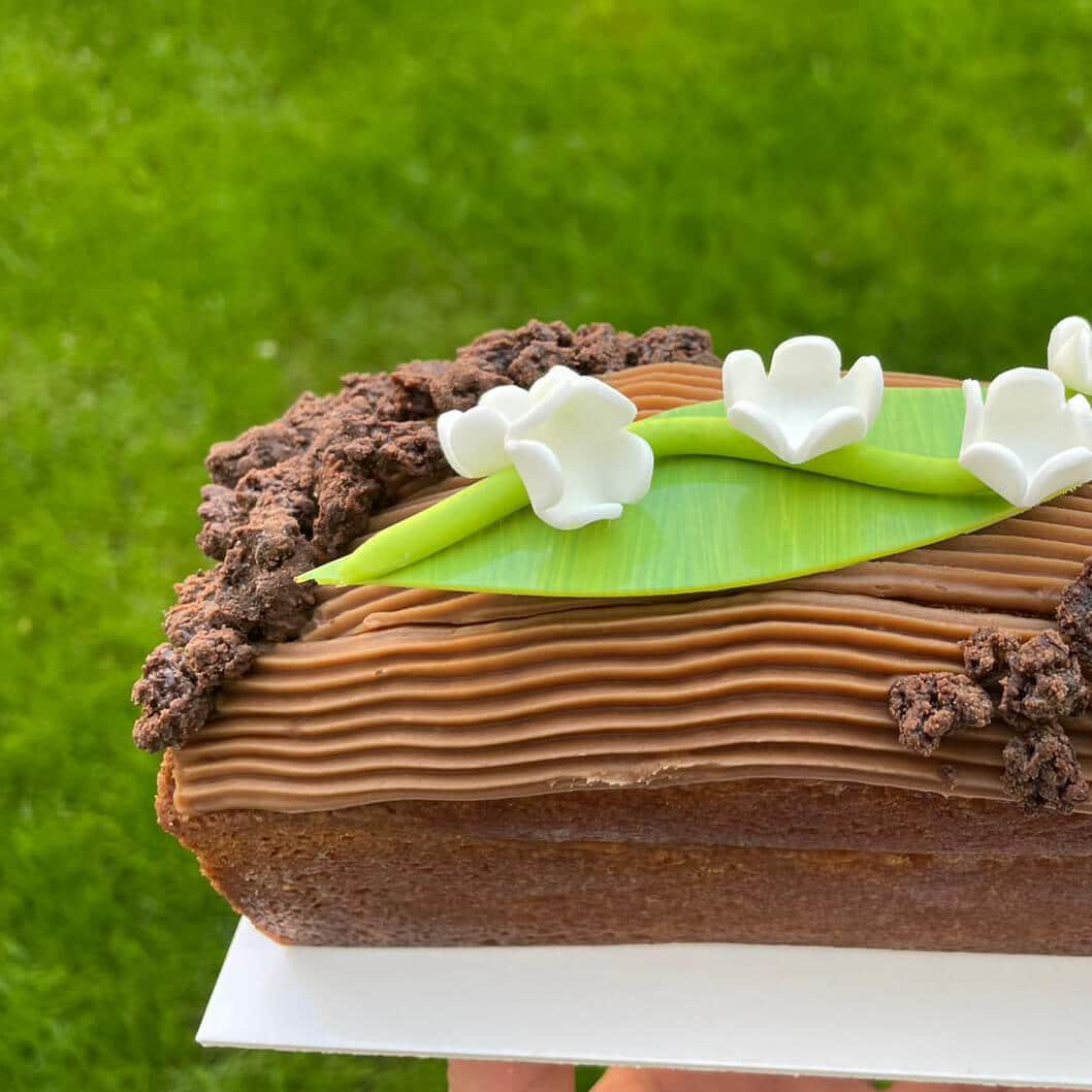 🌸 Cake du 1er mai : cake moelleux à la noisette, garni de praliné et recouvert d’une ganache gianduja et d’un crumble cacao.